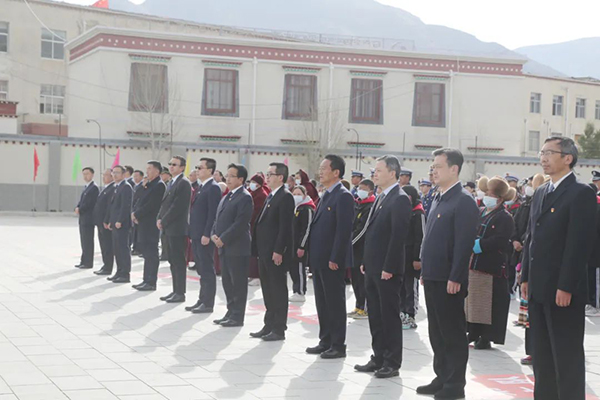 上午10时整,升旗仪式正式开始。伴随着雄壮的《义勇军进行曲》,鲜艳的五星红旗冉冉升起,全场齐声高唱国歌,满怀深情纪念西藏百万农奴解放64周年。